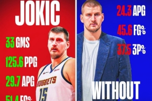约基奇出场的33场比赛,掘金场均得分125.6分,29.7助,命中率51.4%,三分41%。