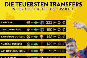 足坛历史最贵转会:内马尔2.2亿欧居首,伊萨克第4&维尔茨第8